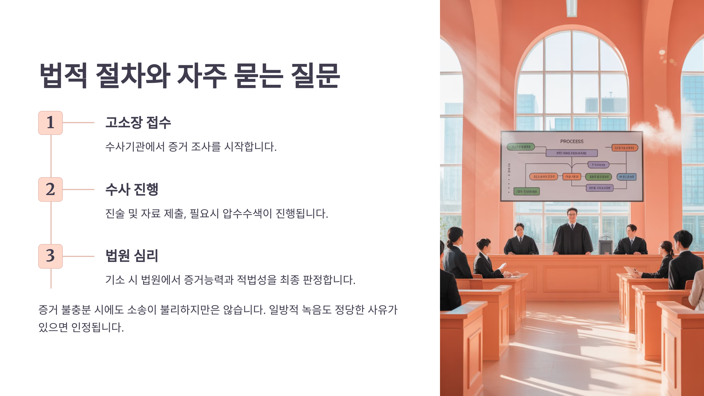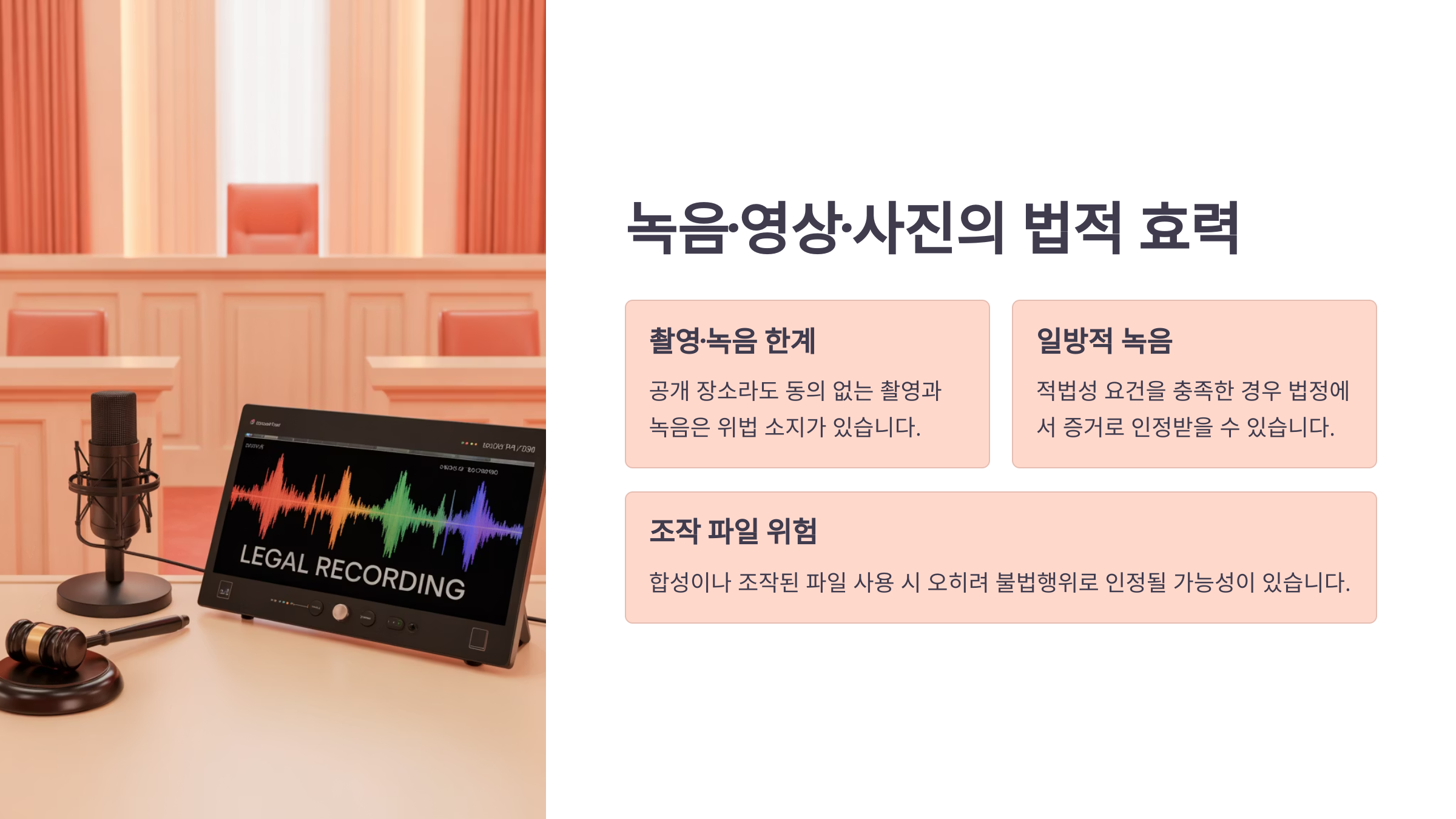 하지만, 제3자의 대화를 몰래 녹음하거나, 감시 목적의 영상 촬영은 불법이 될 수 있어요. 증거를 수집할 땐 반드시 본인이 피해 당사자인 상황에서만 녹음을 해야 하고, 내용도 범죄 사실을 입증하는 수준이어야 해요.