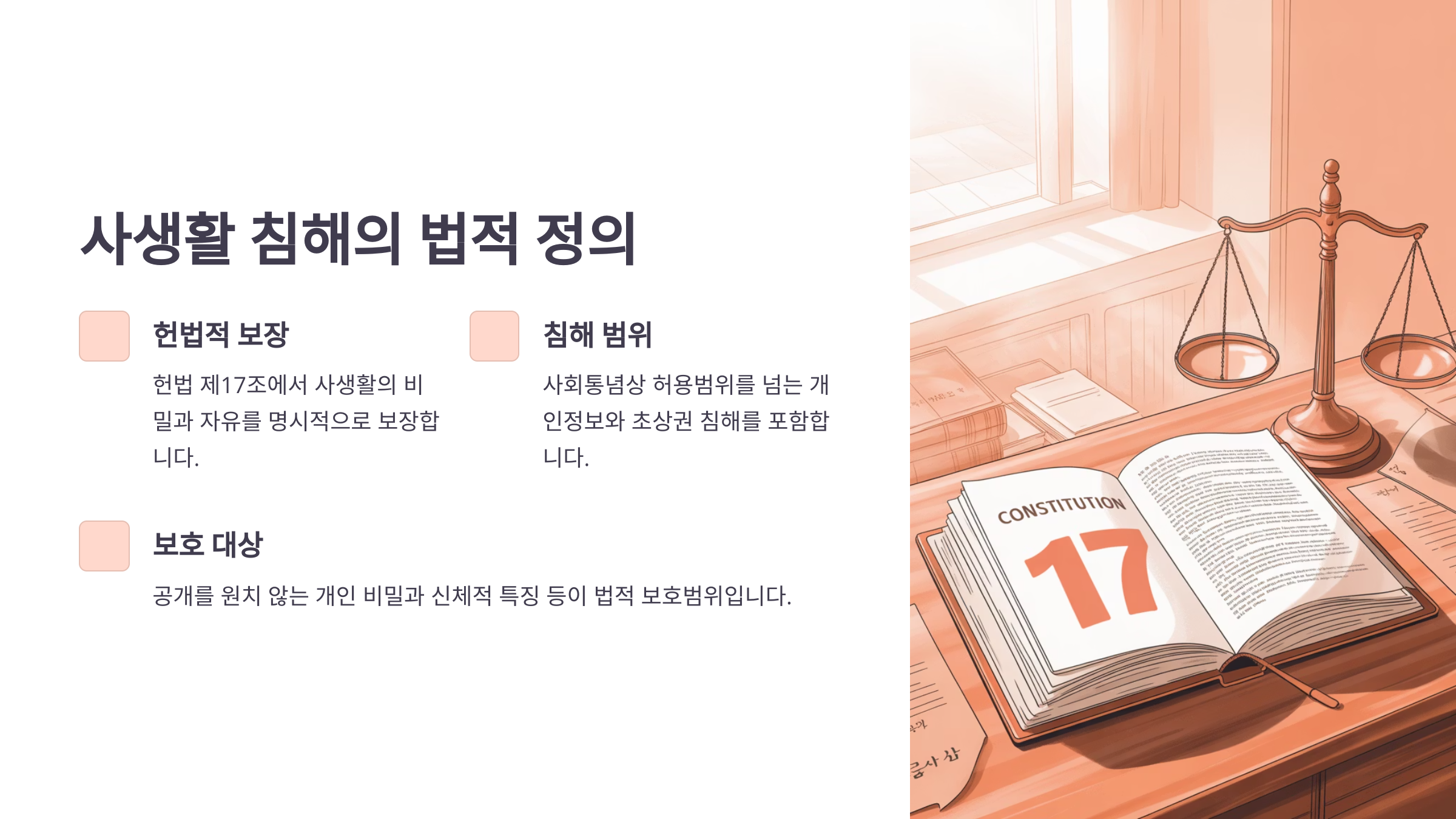 이제 어떤 증거가 필요한지 알아보기 전에, 어떤 상황이 법적 판단에서 ‘사생활 침해’로 인정되는지를 정확히 아는 것이 가장 첫걸음이에요.
